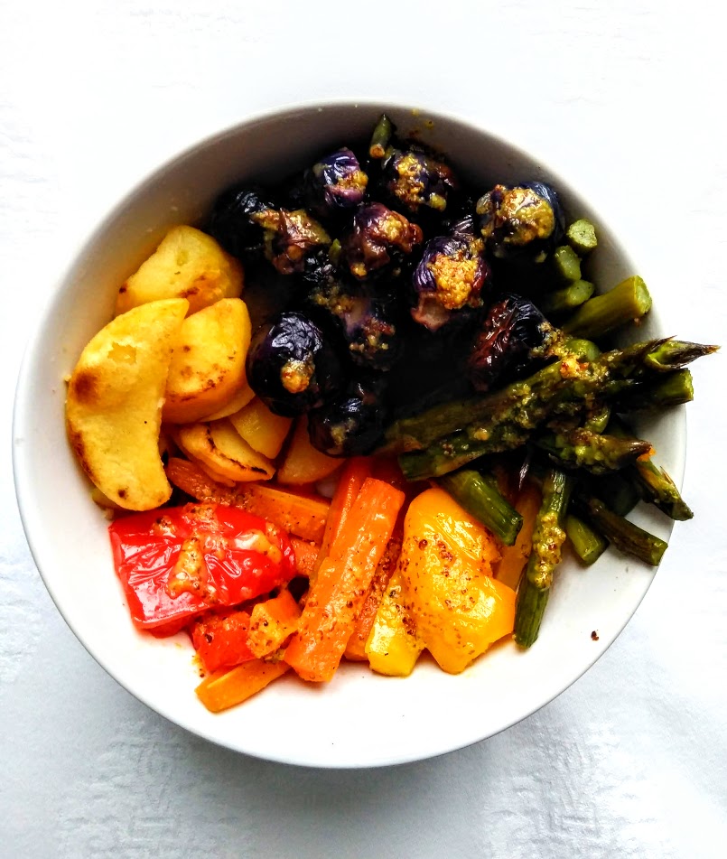 Gister at ik de geroosterde regenboog groenten die ik eerder al poste met aardappeltjes en een worstje. Vandaag was er op de worstjes na nog wat over dus dat at ik als lunch, en ik miste het vlees eigenlijk helemaal niet. Het was vol met verschillende smaken en vulde goed. Om wat meer eiwitten aan het gerecht toe te voegen kun je nog wat vlees, vis of tofu toevoegen.