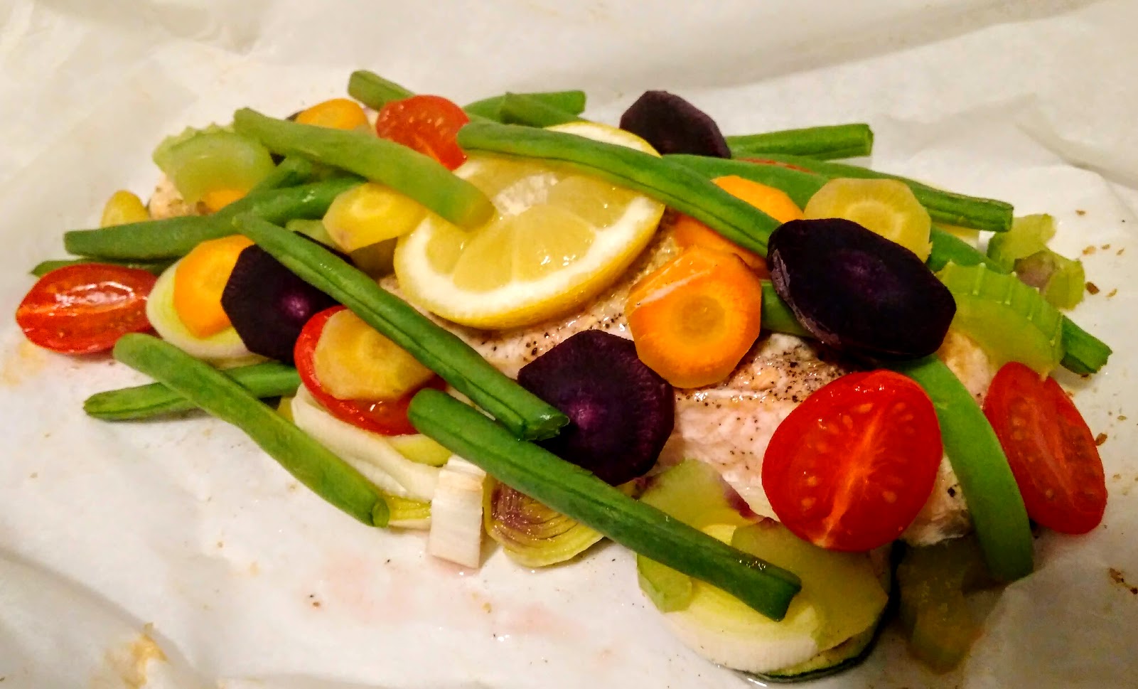 Ik eet niet zo vaak verse zalm, omdat het zo duur is. Maar wanneer het in de aanbieding is koop ik af en toe een pakje. Dan wil ik er wel graag iets speciaals mee doen. Deze keer maakte ik een zalmfilet uit de oven met veel groenten, verpakt in een vel bakpapier. De kruiden hield ik heel simpel en neutraal: zout en peper met gemalen mosterdzaad en venkelzaad, zodat de zachte smaak van de verse zalm niet overheerst zou worden. Met de kruiden kun je echter alle kanten op, net als de groenten. Let bij de groenten wel goed op dat ze een verschillende gaartijd hebben. Zelf heb ik bijvoorbeeld de sperziebonen van tevoren heel kort gekookt en de winterpeen in kleine plakjes gesneden omdat deze groenten wat harder zijn dan bijvoorbeeld de courgette. Op die manier wordt er niks overkookt terwijl sommige groenten nog niet gaar zijn. Omdat het weekend is en ik niet zoveel zin had om lang in de keuken te staan, gooide ik voor het gemak wat aardappelkroketjes bij de vis in de oven.