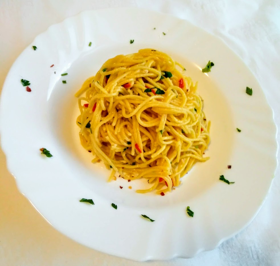 Deze week is de Nationale Week Zonder Vlees, dus ook onze pasta avond moest vegetarisch zijn deze keer. Wat is er dan makkelijker dan een super Italiaans recept dat van zichzelf al vegetarisch is? Spaghetti aglio, olio e peperoncino, ofwel spaghetti met knoflook, olie en peper, is een heel eenvoudig gerecht, zoals veel pastagerechten in Italië zijn. Omdat het recept maar om enkele ingrediënten draait, is het wel van belang dat die producten van goede kwaliteit zijn. Normaal gesproken gebruik je extra vierge olijfolie bijvoorbeeld alleen als saladedressing, maar in dit recept is de beste olijfolie wel geschikt om te verwarmen. Ik heb het geluk dat ik familie in Portugal heb die zelf olijfolie maken, dus ik heb altijd een fles met de heerlijkste olijfolie in de kast staan. Omdat deze spaghetti van zichzelf zo simpel is, vind ik het lekker om er een uitgebreide salade bij te maken. Als je meer tijd hebt kun je er ook een bijgerecht van geroosterde groenten als aubergine en courgette bij serveren.
