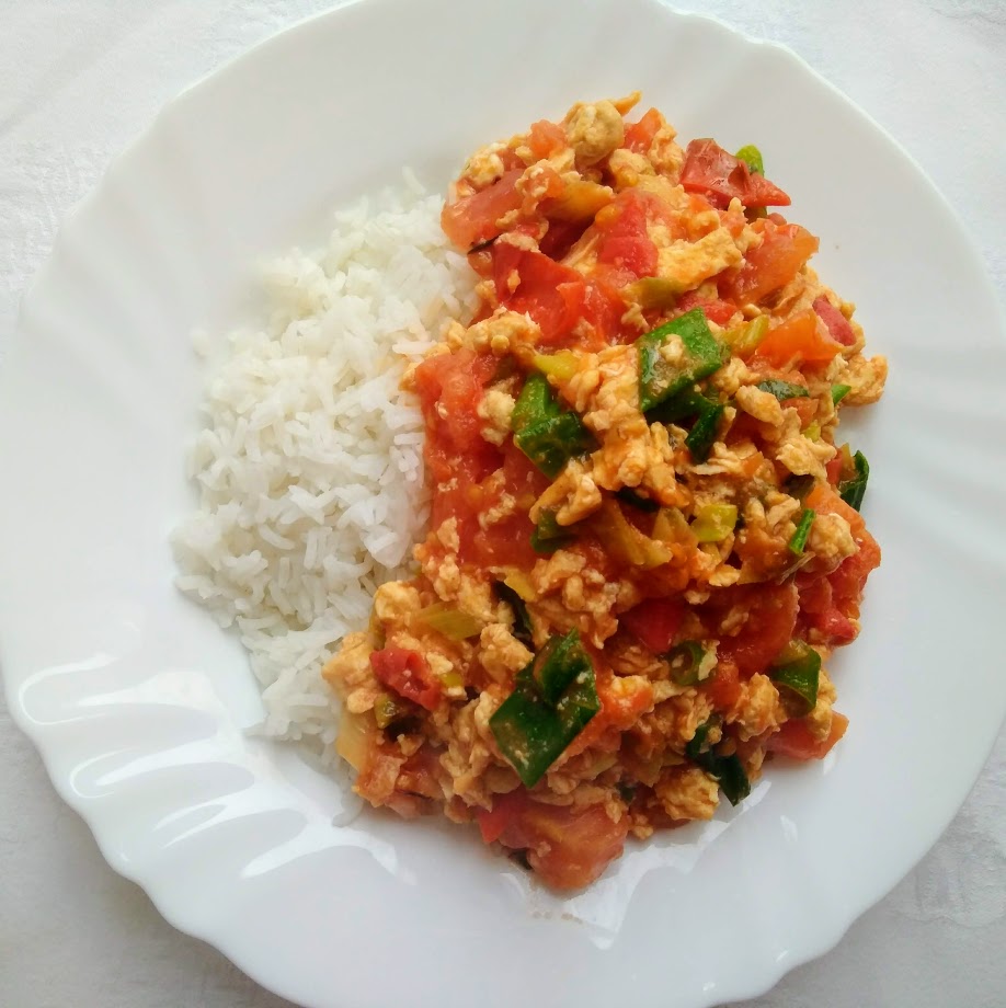 Toen ik een aantal jaar geleden mijn broer bezocht in Shanghai, heb ik dit gerecht voor het eerst gegeten. Natuurlijk maakte we vroeger op de camping ook vaak een grote pan met ‘ei, ui en tomaat’, het makkelijkste en lekkerste gerecht als je op vakantie bent, maar in China smaakte het toch heel anders. In het kleine ‘gele tentje’ dat mijn broer mij had aangeraden, zat ik na een lange vliegreis voor een bord stomende rijst met een berg roerei en tomaat erop. Wat was dat lekker. Door vlagen van heimwee die ik wel eens heb aan Chinees eten, heb ik dit gerecht thuis wel eens proberen na te maken. Toch miste er altijd wat en was het niet hetzelfde als het roerei van dat ene gele tentje. Pas sinds kort heb ik het geheim ontrafeld, namelijk sesamolie en rijstazijn. Een kleine hoeveelheid van deze twee producten maakt al een wereld van verschil. Nu geniet ik bijna elke week weer van Chinees roerui met tomaat. Soms op een geroosterde boterham, soms over wat rijst. Meestal eet ik het als lunch, maar als je er wat groenten bij kookt, zoals broccoli of peultjes, kan je hier ook prima een volwaardige avondmaaltijd van maken.