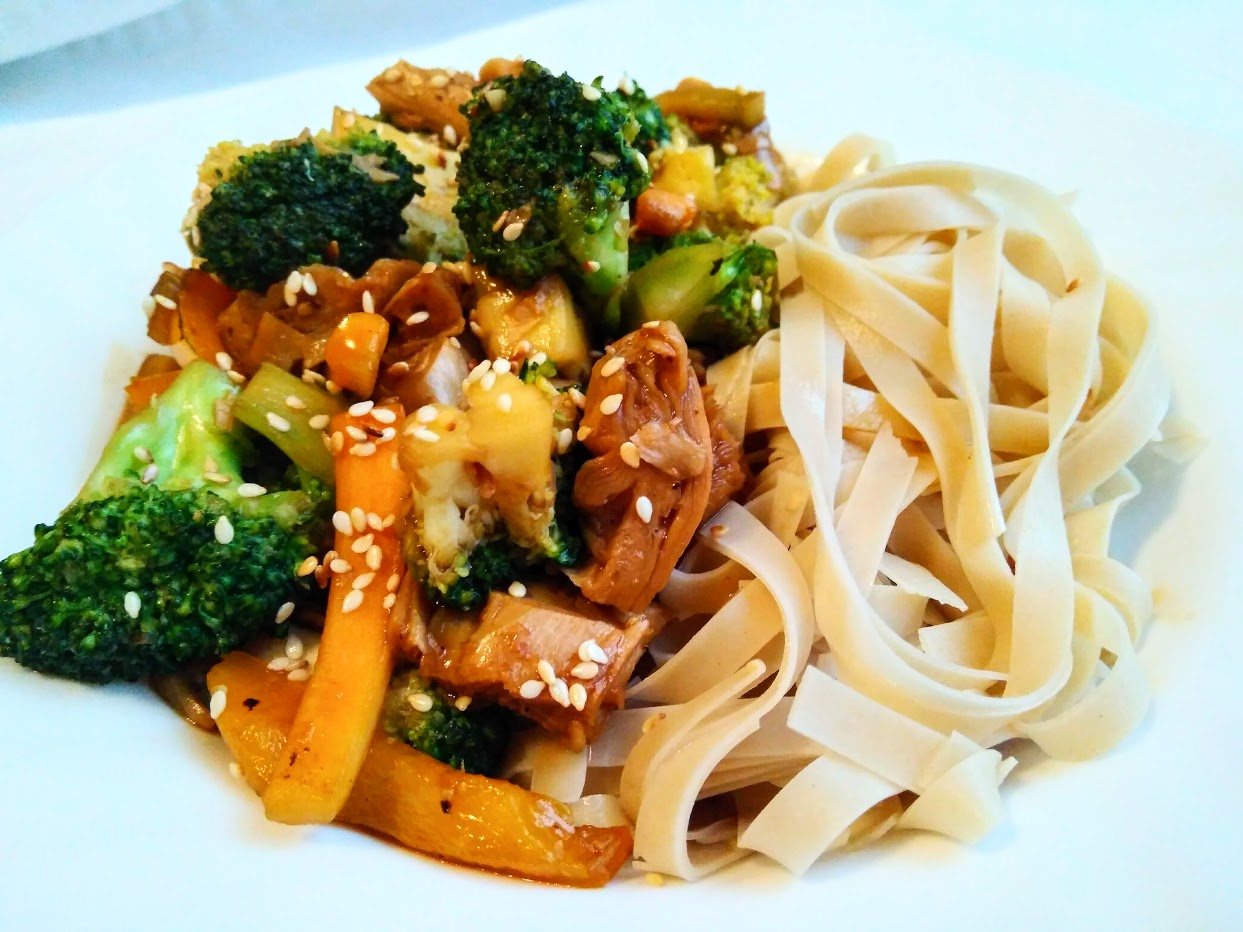Dit recept is glutenvrij en vegetarisch. De vega-kip van de Albert Heijn is niet alleen glutenvrij, maar ook helemaal vegan. Dit is niet bij elk merk het geval dus check altijd goed het etiket.