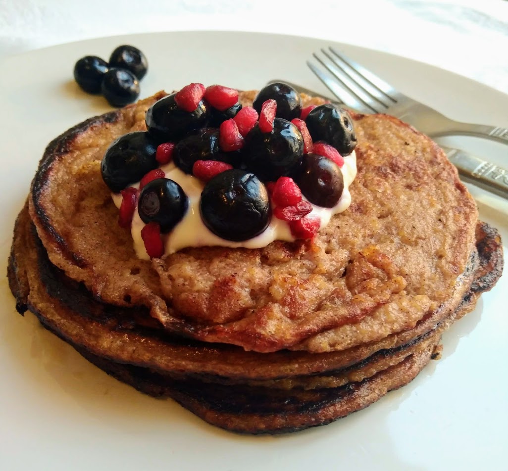 Eigenlijk doe ik niet heel vaak iets geks of extra luxe voor mijn ontbijt, maar toen ik 2 overrijpe bananen in de fruitschaal zag liggen die echt op moesten, dacht ik aan de havermout-banaan pannenkoekjes die ik eerst nog wel eens voor mezelf maakte. Perfect voor de zondag! Toen gebruikte ik altijd ei, maar deze keer wilde ik proberen of een compleet vegan variant me ook zou lukken. Ei heeft een bindende functie, dus ik verwachte wel wat moeilijkheden met het draaien van de pannenkoeken in de pan. Uiteindelijk bleek dit best mee te vallen. Het enige wat je nodig hebt is een beetje meer geduld en een deksel die goed op je koekenpan past. De pannenkoekjes moeten namelijk wat langzamer en langer garen dan normaal. Wanneer je ze op te hoog vuur bakt, is de onderkant al verbrand voordat je de pannenkoek fatsoenlijk om kan draaien. Het duurde dus wat langer, maar dat is op een zondag helemaal niet zo erg. De smaak en structuur waren verder erg goed. Ik deed nog een flinke lepel sojayoghurt op mijn stapel pannenkoeken met wat blauwe bessen en granaatappelpitjes, een echte traktatie.