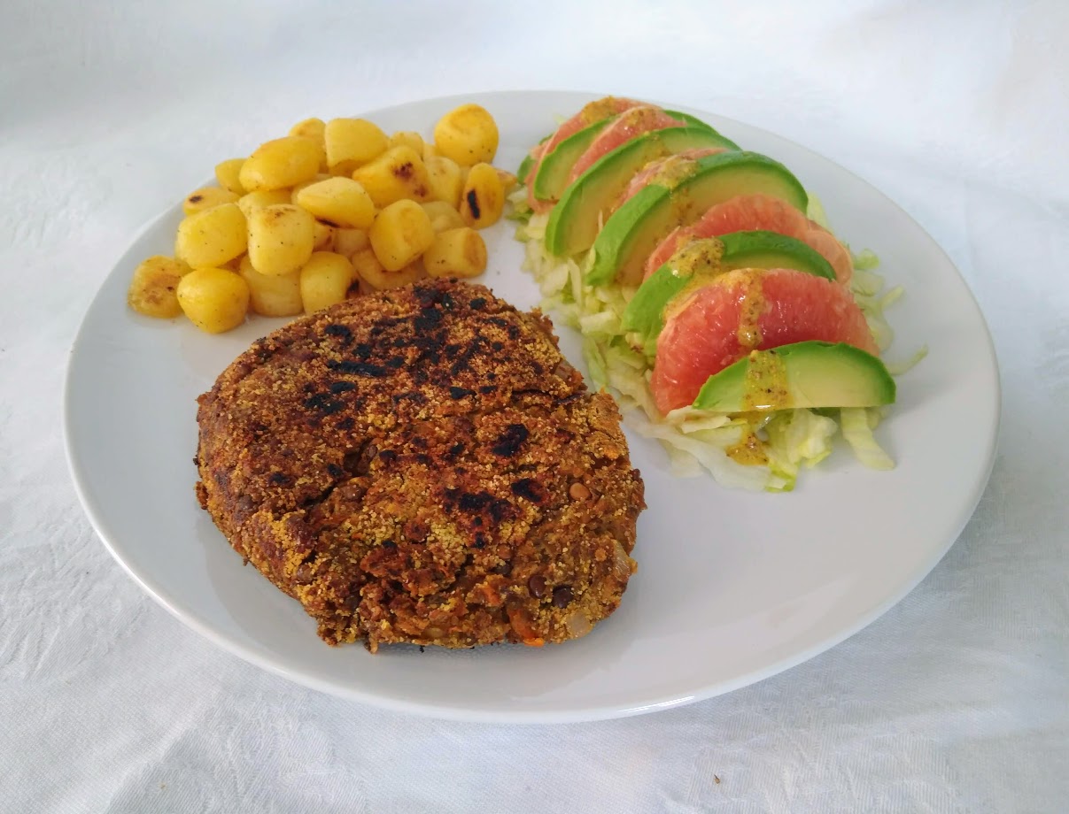 In de supermarkt liggen de schappen vol met kant en klare linzenburgers. Deze zijn helaas nooit glutenvrij. Tijd om er zelf een te maken. Eigenlijk is dat hartstikke makkelijk dus een kant en klare burger in de winkel kopen is sowieso bijna overbodig. In plaats van op een broodje, aten we de linzenburgers met Hollandse gebakken aardappeltjes en een salade van avocado en grapefruit. Dit is een verrassend frisse en lekkere combinatie, ook de moeite waard om eens te proberen! Ik maakte mijn burgers extra knapperig van buiten door ze in wat glutenvrij paneermeel te wentelen voordat ik ze in de pan gooide. Dit is echter geen vereiste, dus als je geen paneermeel in huis hebt, kun je dit ook best achterwege laten. Ik kruidde de linzenburgers met koriander en komijn, maar je kan zelf variëren met de kruiden die je lekker vindt.