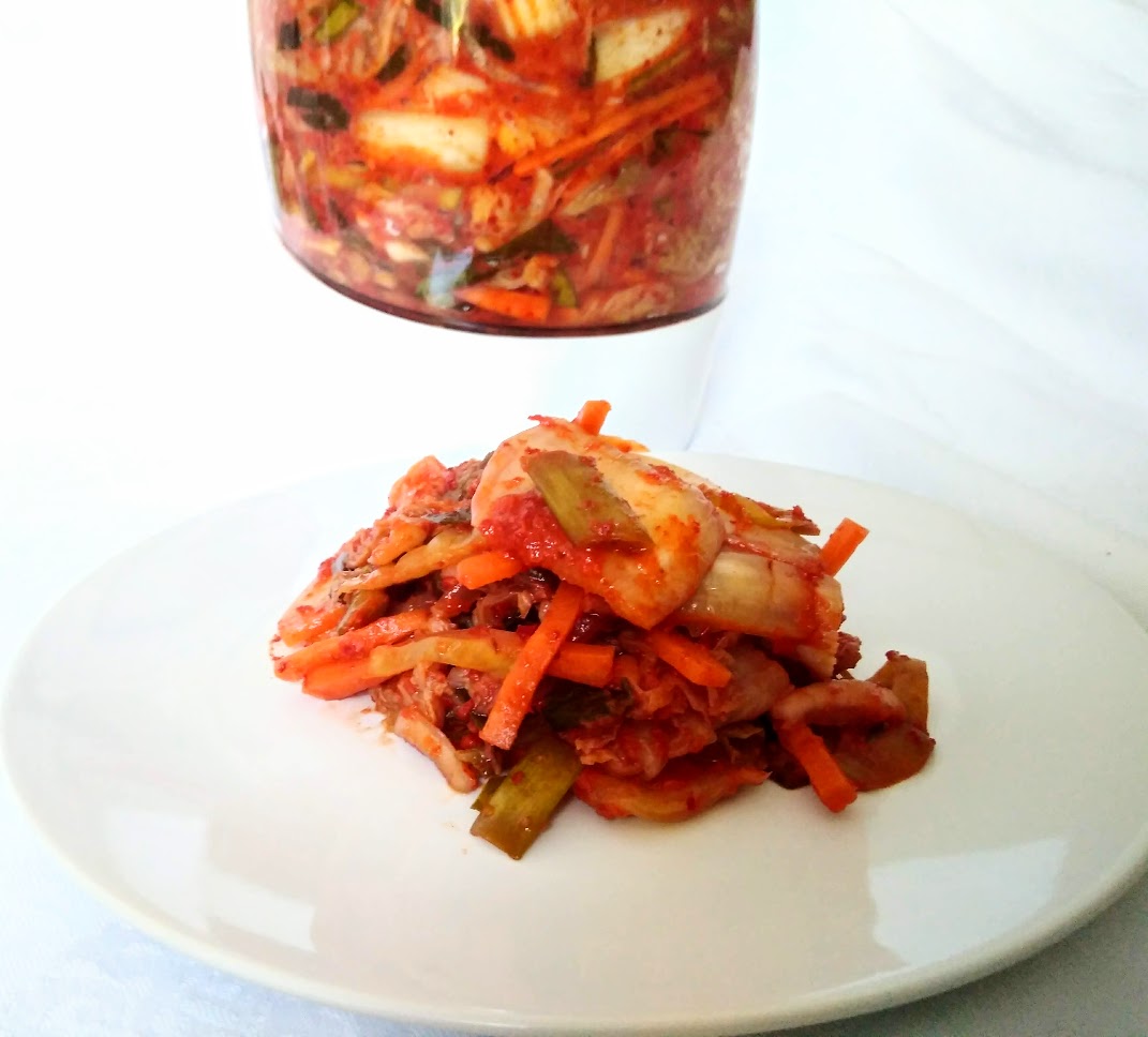 - Doe de kimchi nu in je gesteriliseerde bak of pot. Druk elke paar scheppen alles even flink naar beneden met een (schone!!!) lepel, zodat er zo min mogelijk lucht tussen de kimchi blijft zitten. Sluit de bak of pot af en laat deze ongeveer 3 dagen op kamertemperatuur staan. De kimchi moet dan gaan fermenteren. Je kunt de kimchi ook wat langer of korter laten fermenteren om de smaak te krijgen die je zelf het lekkerst vindt. Om het fermentatieproces te stoppen, zet je de kimchi gewoonweg in de koelkast. Daarin is het nog maanden houdbaar. Ik bewaarde zelf een beetje kimchi om alvast dezelfde avond wat verse kimchi bij mijn bibimbap te kunnen eten. Zelfs ongefermenteerd smaakt het al heerlijk!