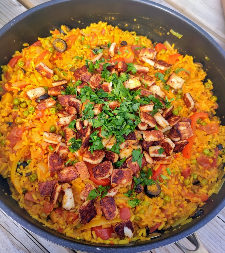 Ok, tegen een Spanjaard zou ik niet durven zeggen dat dit paella is. Niet per se omdat het vegetarisch is, maar omdat ik niet eens paella-rijst gebruik in dit gerecht. In deze snelle rijstschotel zit gele rijst. Hoewel op de verpakking staat dat er saffraan in zit, is dit echt een ieniemienie beetje en krijgt de rijst zijn gele kleur vooral van kurkuma. Vloeken in de Spaanse kerk dus, maar dit recept is wel gewoon een heerlijk zomers gerecht. Vroeger maakte ik het vaak met chorizo en garnalen. Toen ik laatst een box van Hello-Fresh bestelde aten we ongeveer hetzelfde gerecht, maar dan met gebakken halloumi. Ik vond het een goede vervanging voor blokjes chorizo, vanwege de zoutige smaak en stevige textuur. Omdat chorizo normaal gesproken voor veel knoflooksmaak zorgt, heb ik voor deze vegetarische versie gekozen om wat extra verse knoflook toe te voegen. Wij vonden het een erg geslaagde maaltijd (vooral met een glaasje wijn erbij).